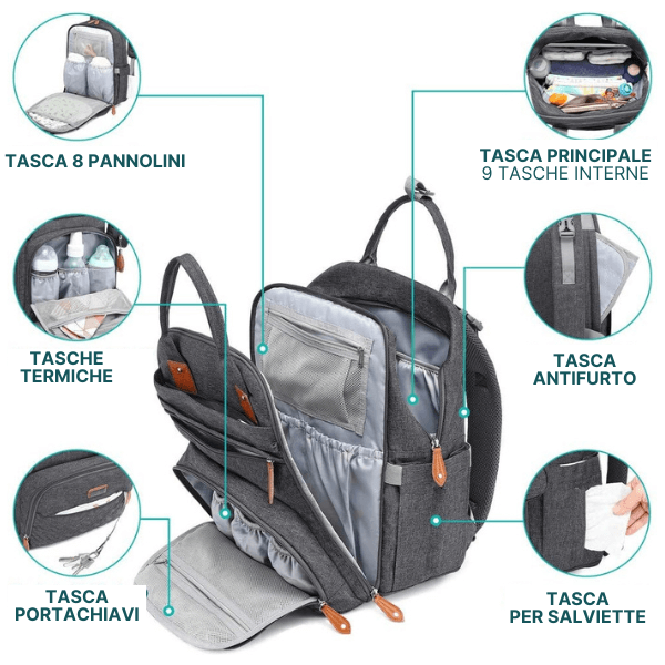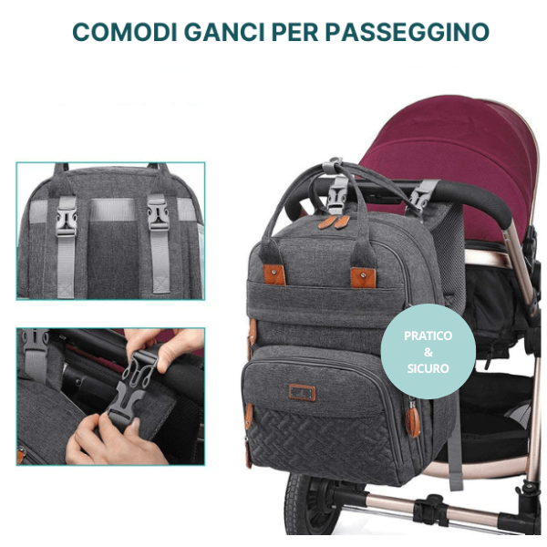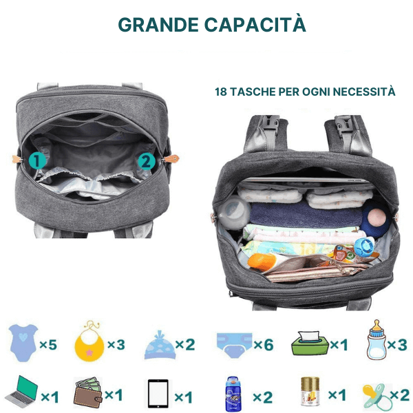 SPAZIOSO: design capiente con ben 18 scomparti e tasche per organizzare tutti gli essenziali del bebè, dai pannolini ai giocattoli, contiene davvero tutto!